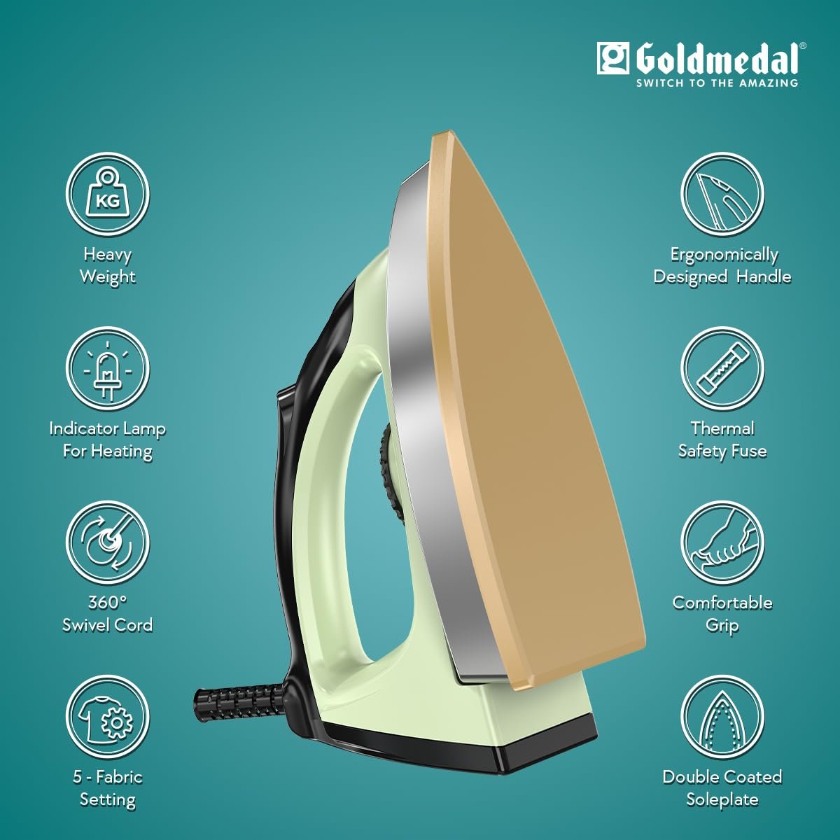 Presenting the powerful Titan heavy-weight dry iron that effortlessly presses out even the toughest wrinkles. Boasting a 360° swivel cord for effortless gliding, its five fabric setting enables you to master every material while its thermal safety fuse ensures ultimate peace of mind. In addition, its non-stick Weilburger premium soleplate delivers a flawless finish while the power indicator keeps you in total control. Featuring a shockproof plastic body and a uniquely designed handle for a comfortable grip, the Titan combines safety, durability and comfort in one sleek package. Make every ironing session a delight with the Titan heavy-weight dry iron.