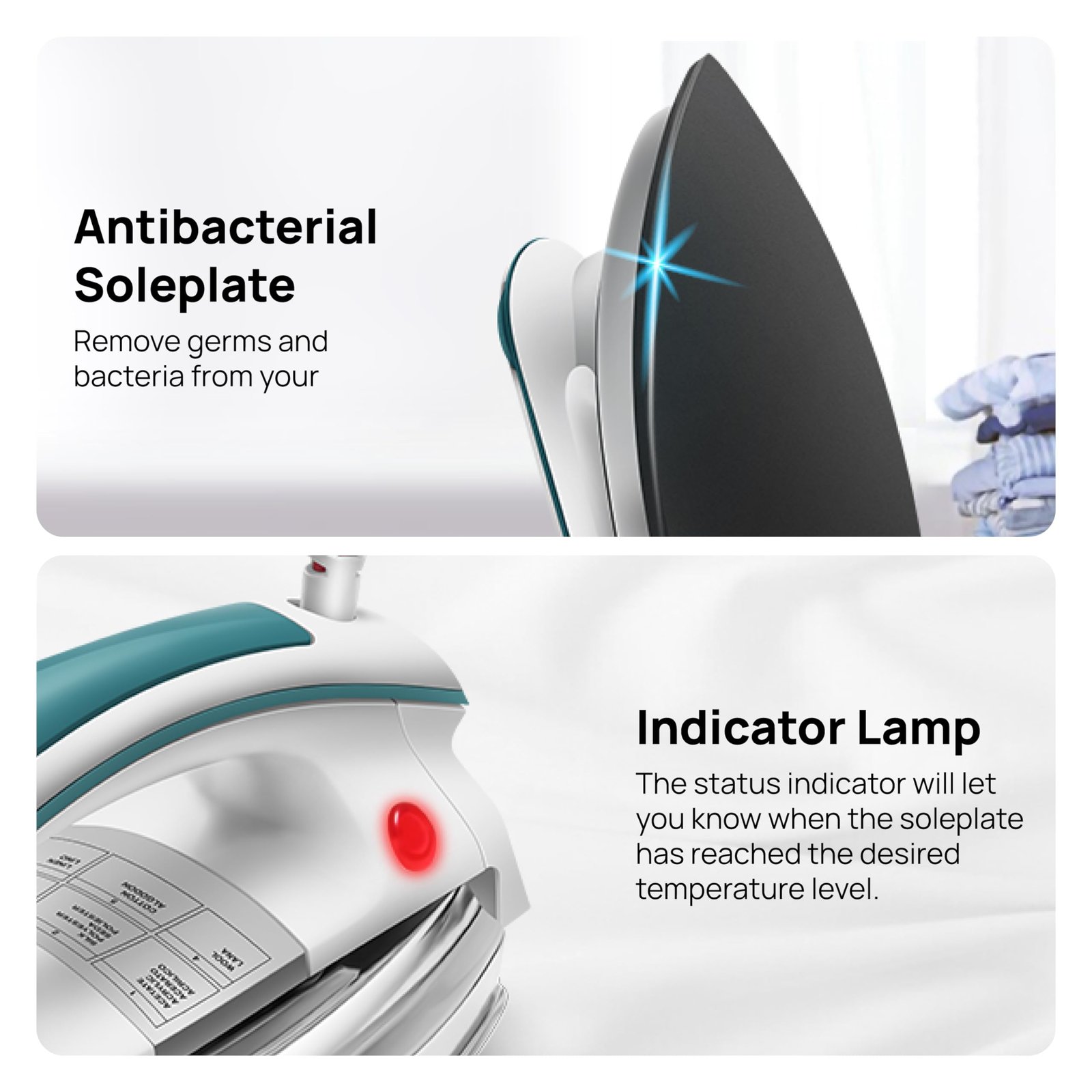 • Soleplate with the double coating of Anti Bacterial Weiberger German Soleplate for wrinkle free smooth and crisp ironing