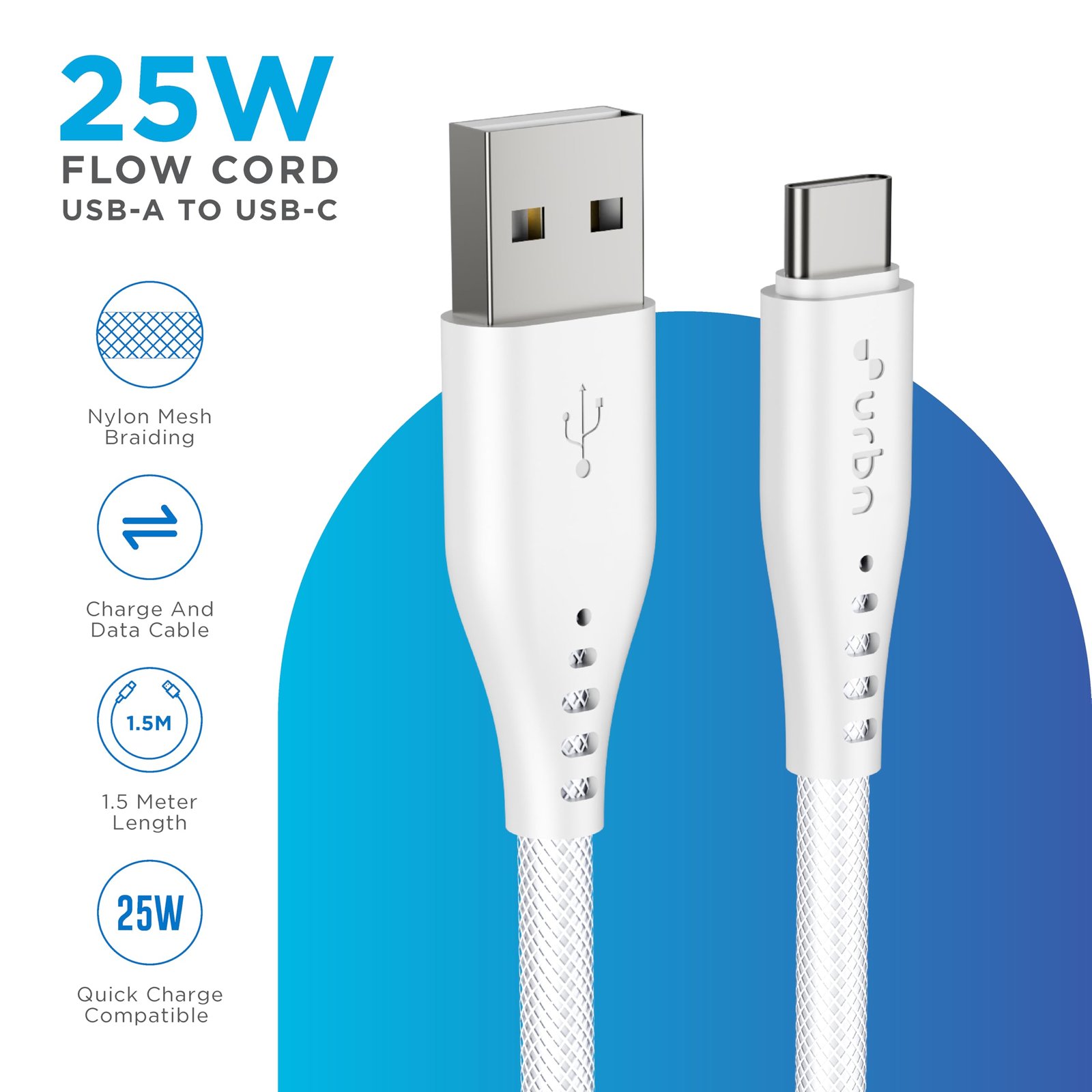 Experience superior charging and data transfer with the Flow Cord 25W USB-A to USB-C cable. This premium 1.5-metre cable features durable nylon mesh braiding that prevents tangling and enhances longevity. Supporting 25W fast charging capability, it can power your device from 0% to 50% in just 35 minutes. The cable delivers impressive 480Mbps data transfer speeds, perfect for quick file transfers and backups. Its universal compatibility ensures seamless connection with various USB-C devices including smartphones, tablets, and accessories. The thoughtfully designed white cable includes quality connectors and comes with a 6-month replacement warranty. The tangle-free design and 3A fast charging support make it an ideal choice for both home and office use. Whether you’re charging your device or transferring data, this cable offers reliable performance and durability for your daily connectivity needs.