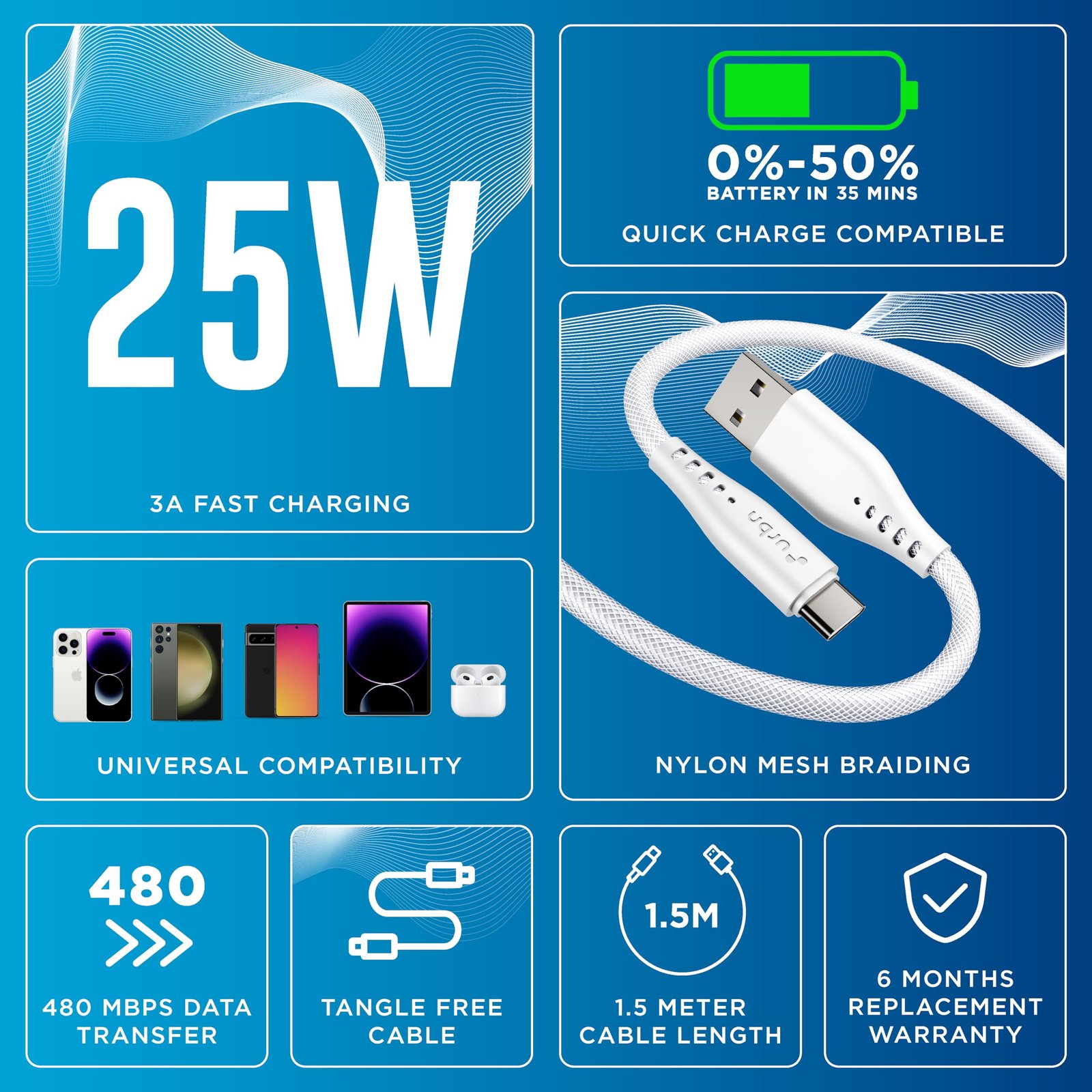 • SPECIFICATIONS: 1.5-metre cable length with USB-A to USB-C connectivity, backed by 6-months replacement warranty