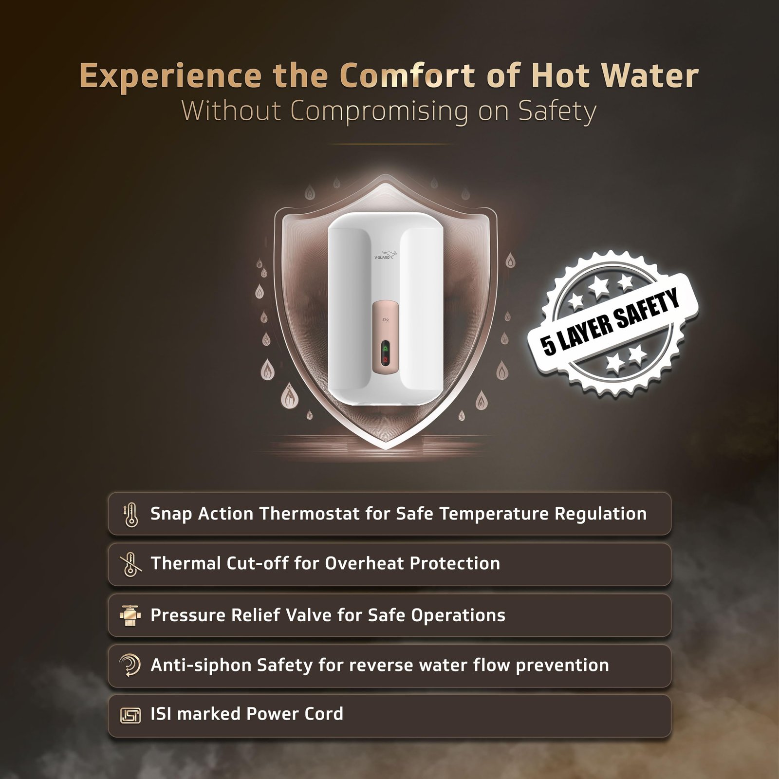- ADVANCED 4 LAYER SAFETY: Pressure release valve for safer operations at higher pressures, ISI marked thermostat for cutting off power supply when temperature exceeds 55°C, Overheating protection through disc type snap action safety device operating at 90°C & Anti-siphon Protection for preventing the reverse flow of water