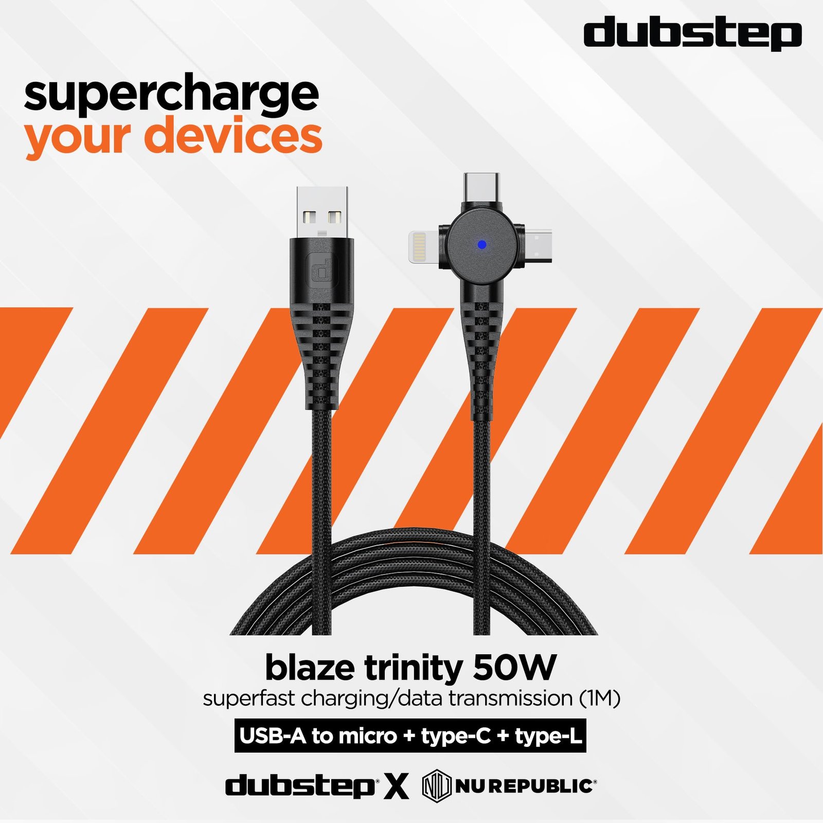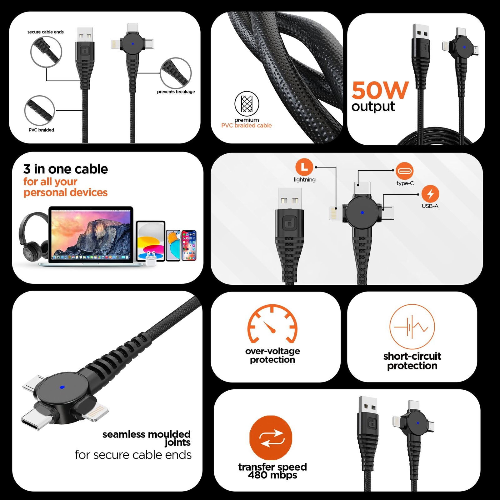 Supercharge your device with ‘s Trinity 50W 3-in-one premium braided cable. Featuring super-fast 50W charging, built-in thermal power management, ‘s proprietary Powerblitz technology, and supporting all fast charging technologies, Trinity 50W will take care of all your charging needs.