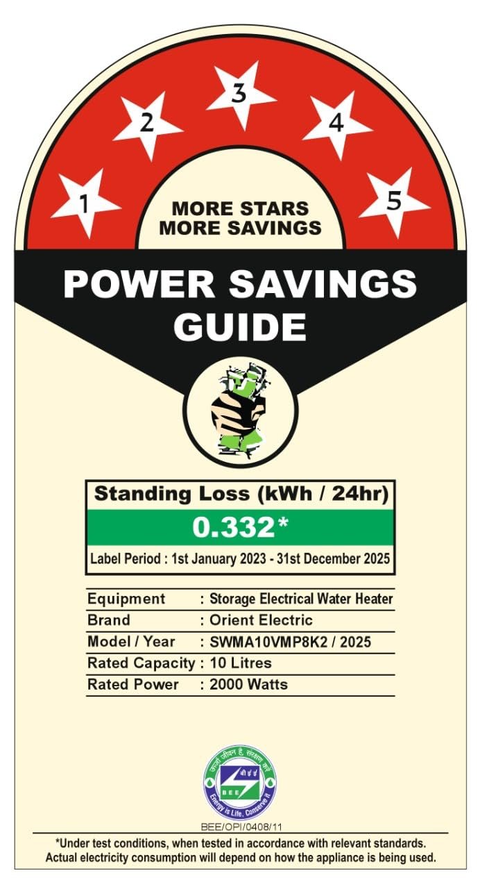 • BEE CERTIFIED 5-STAR EFFICIENCY – Engineered to deliver hot water faster while consuming less energy. BEE Label Period-1st Jan, 2023 to 31st Dec, 2025.