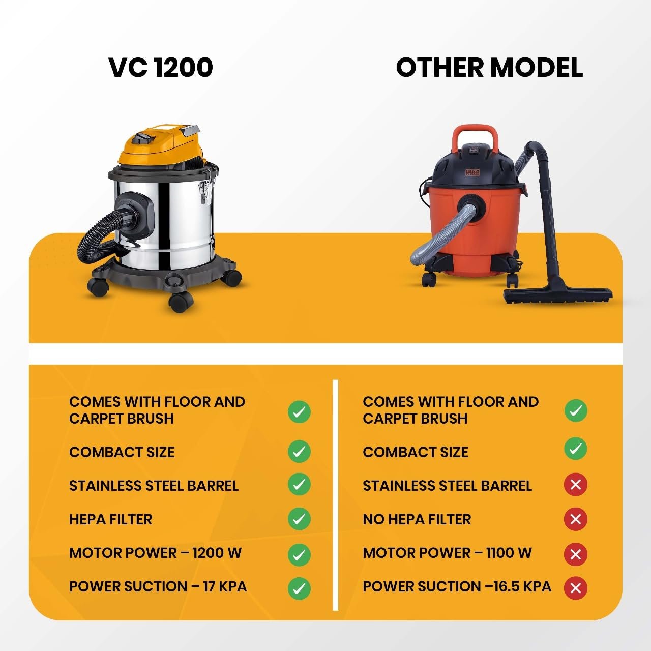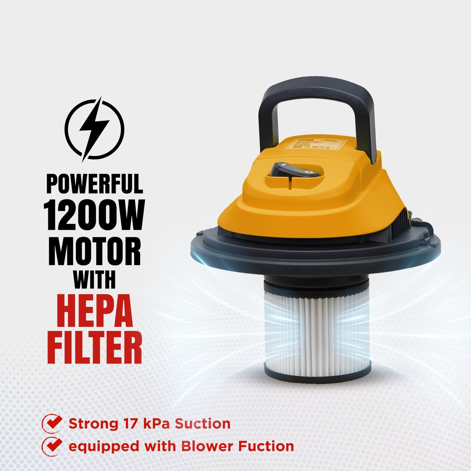 Powerful 1200W Motor & High Suction: The VC1200 vacuum cleaner for home use wet and dry features a heavy-duty 1200W high-efficiency motor with 17 kPa strong suction, ensuring superior cleaning performance for both solid particles and liquids.