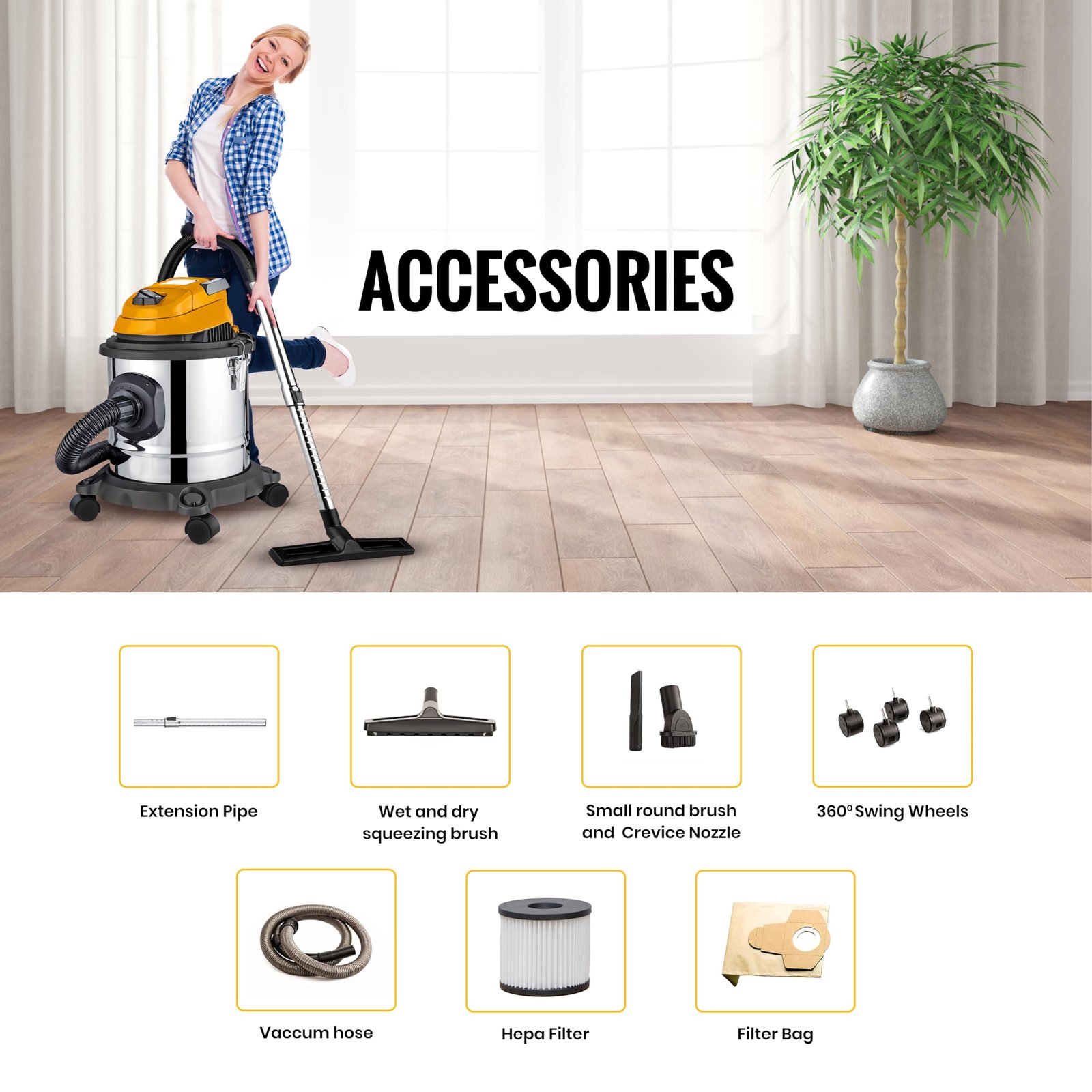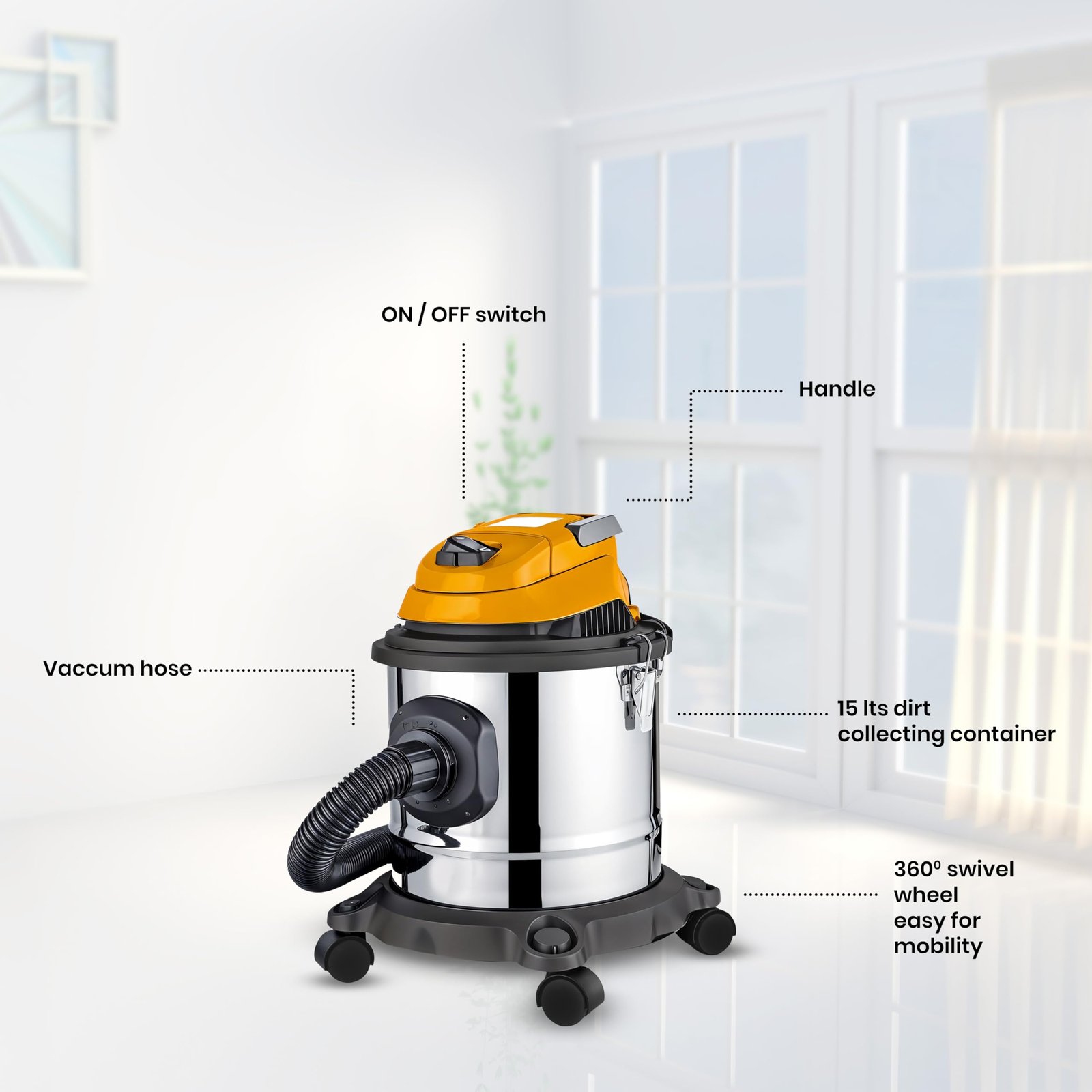 Large 15L Stainless Steel Barrel: Designed for home and car cleaning, the stainless steel 15-liter dust barrel provides enhanced durability and capacity, making it an ideal wet and dry vacuum cleaner for home or car vacuum cleaner 2 in 1.